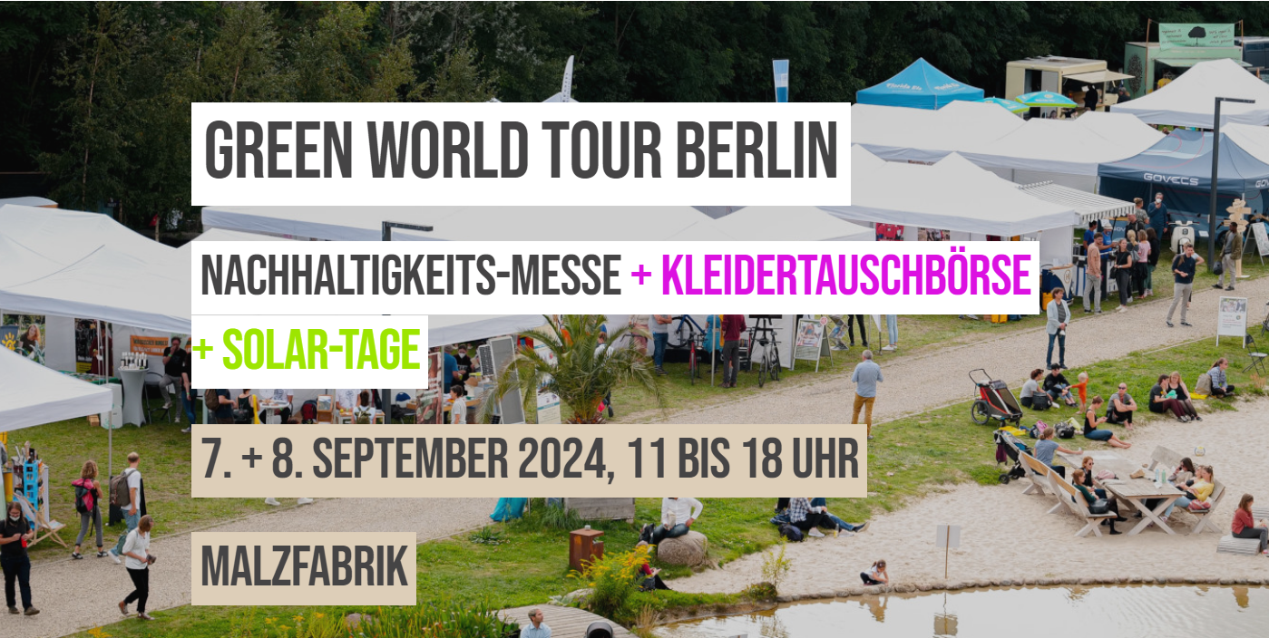 Hier gibt es weitere Infos zur Green World Tour, du kannst du dir das Verzeichnis der Aussteller*innen anschauen und dir dein persönliches Vortragsprogramm zusammenstellen.