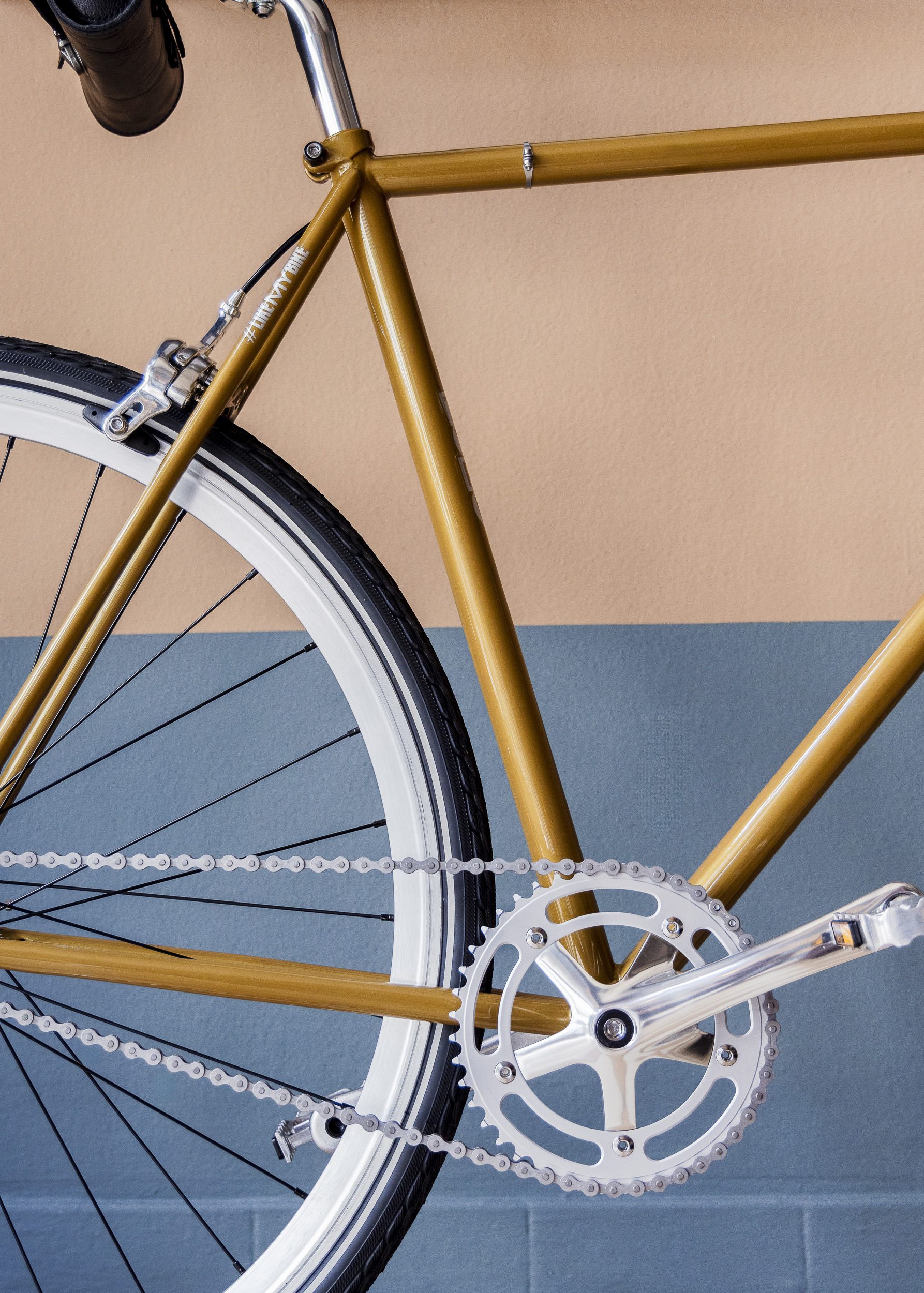 Fabian hat ein Fahrrad in Anlehnung an Deutschlands beliebtestes Oldie-Cabrio, den Mercedes SL R 107 kreiert. Wer sich vielleicht erinnert: Bobby Ewing fuhr in der Serie „Dallas“ einen R 107 und sorgte damit für sagenhafte Absatzzahlen beim schwäbischen Autobauer.